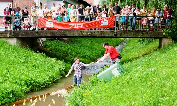 Ergoldsbach. Am Sonntag veranstaltete die Kolpingsfamilie zum vierten Mal ein Entenrennen auf dem Goldbach. Über 200 gelbe Gummienten machten sich von der Startbrücke Mühlenstraße/Landshuter Straße auf die Reise, bis nach 200 Metern das Ziel Kirchenbrücke erreicht wurde. Nicht nur die Kinder waren begeistert, als nach knapp zehn Minuten die ersten Entchen im Auffangtrichter ankamen und die Sieger feststanden.