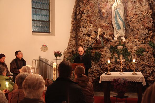 Nach Begrüßung und Einführung durch Diakon Christian Falter vor der Pfarrkirche Sankt Peter und Paul und dem Lied "Ja, wenn der Herr" startete die Prozession. Die Gläubigen marschierten über die Friedhofstraße und die Bayerbacher Straße Richtung Kapellenberg. Dabei wurde der Rosenkranz mit zum Thema passenden Geheimnissen gebetet. Der Wortgottesdienst begann bei Ankunft in der Bergkapelle mit dem Lied "Wo zwei oder drei". Nach der Lesung aus dem Lukasevangelium über den barmherzigen Samariter trug Diakon Falter seine Gedanken zum Thema vor. Anschließend wurde das Lied "Von guten Mächten" gesungen und die Fürbitten vorgetragen. Nach einem gemeinsamen "Vater unser" traten die Gläubigen den Rückweg an. Seinen Abschluss fand der Kerzenzug in der Pfarrkirche. Dort wurden die Teilnehmer nach einem "Segne du Maria" und dem Segen in die Nacht entlassen.