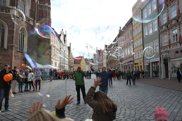 Roland Kraus ließen Riesenseifenblasen durch die Altstadt fliegen. Am