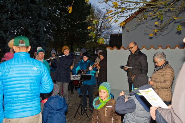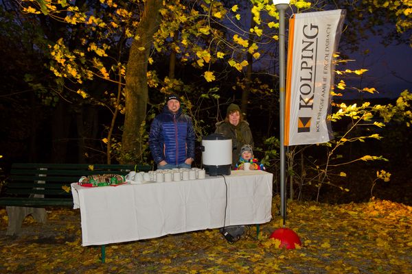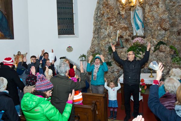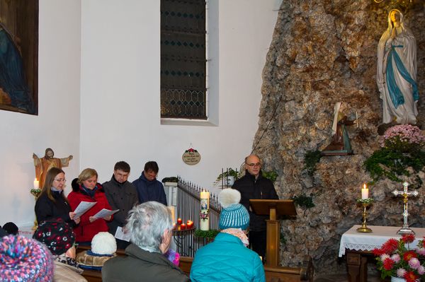 Anschließend begann der Wortgottesdienst in der Lourdeskapelle mit dem Lied "Kleines Senfkorn Hoffnung". Es folgten die Fürbitten und die Lesung aus dem Brief an die Römer. Nach dem Lied "Laudate omnes gentes" trug Diakon Falter seine Gedanken zum Thema "Hoffnung" vor. Nach einem gemeinsamen "Vater unser" und dem Schlusssegen wurde noch zu Ehren der Mutter Gottes "Milde Königin gedenke" gesungen. Wie im letzten Jahr wurde im Anschluss nicht wieder gemeinsam herunter gegangen, sondern die Teilnehmer waren von den Kolpingfreunden zu Punsch und Lebkuchen an der Bergkapelle eingeladen.