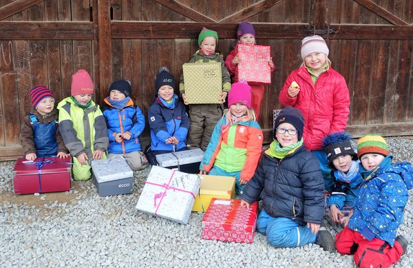 Stolz präsentieren die Waldkindergartenkinder ihre Päckchen